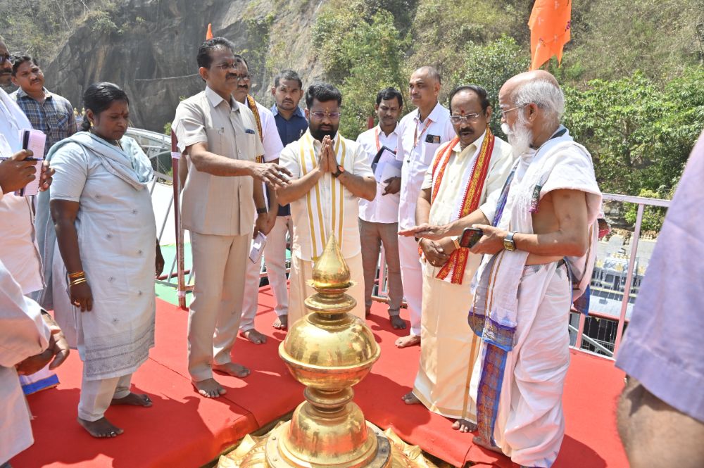 A spiritual atmosphere prevailed today at the Sri Durga Malleshwara Swamy Temple in Vijayawada. Under the leadership of the temple administration officer Sri Seenanayak, the chief priest Sandilya and the priest team unveiled the flag of Sri Anjaneya Swamy atop the temple's vimana with great devotion.