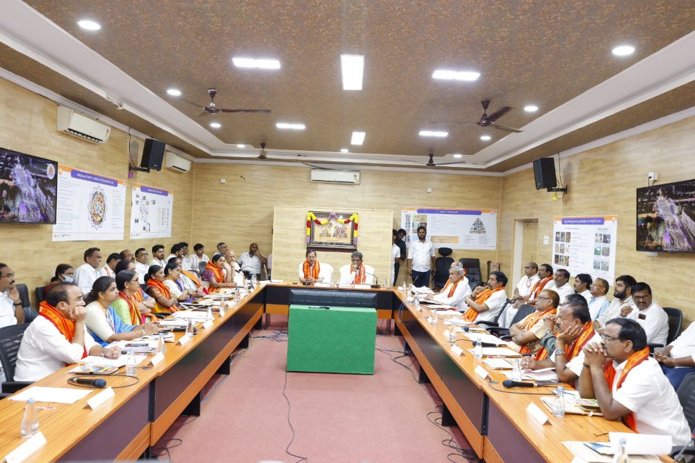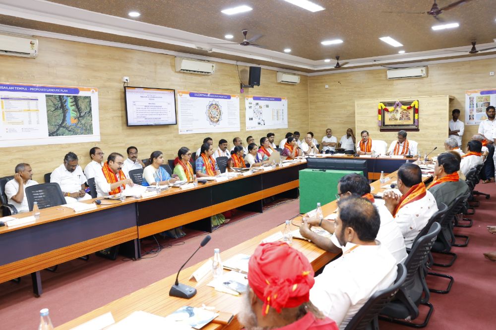 A total of 28 items were discussed in this meeting, of which 23 items were approved. Four items were deferred, and one item was rejected. The meeting extensively discussed the facilities that need to be provided for the general devotees. A detailed project report was comprehensively reviewed to finalize the master plan designed with the needs of the next 30 years in mind. It was decided to give top priority to facilities such as dormitory construction, toilets, and vehicle parking areas in the master plan. Additionally, it was resolved to include the necessary constructions in the master plan to further develop the Srisailam temple as a spiritual center.